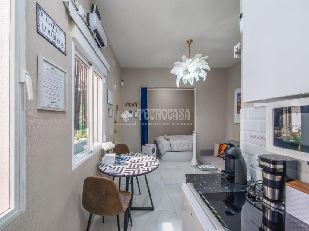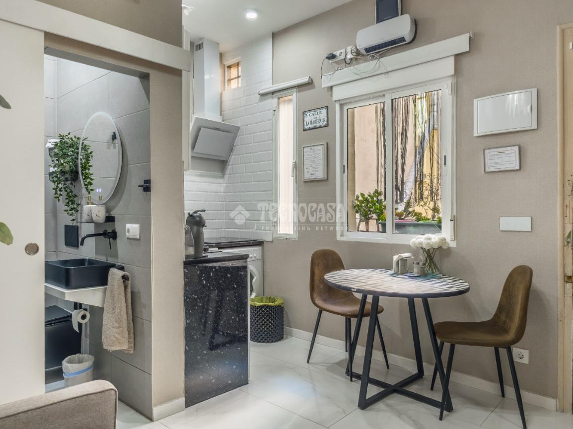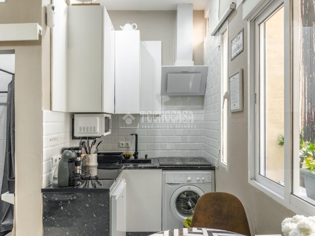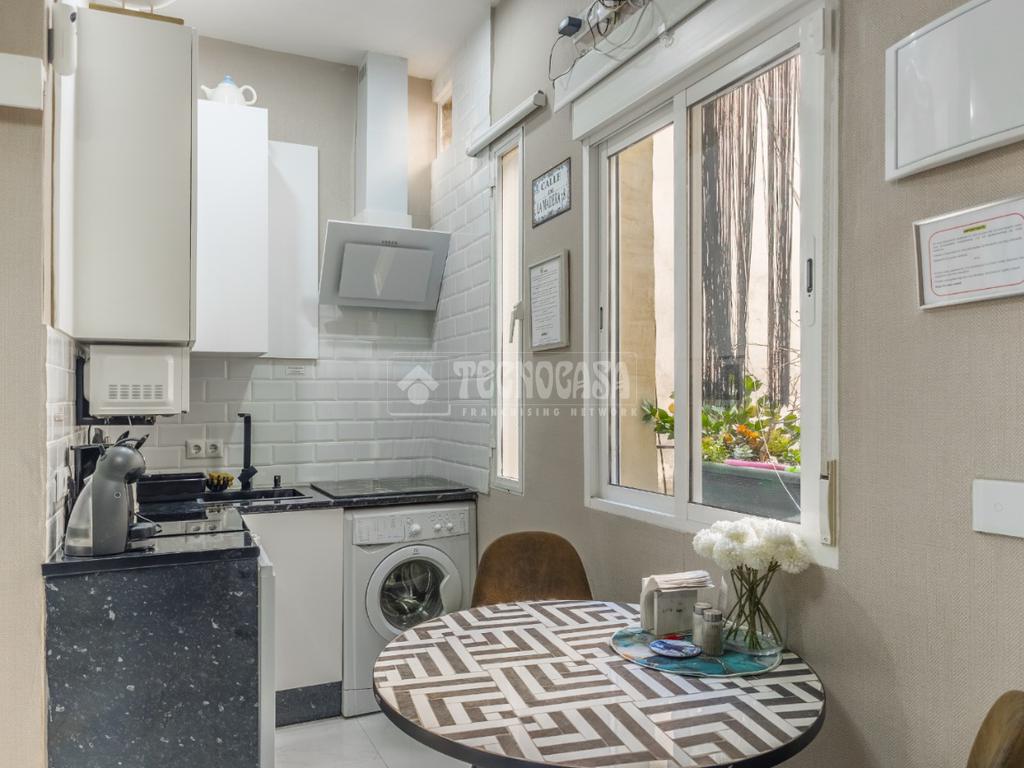 En la entrada nos encontramos con el salón - cocina de la vivienda tiene una ventana amplia con vistas al patio interior de la finca, generando luminosidad a la vivienda.
